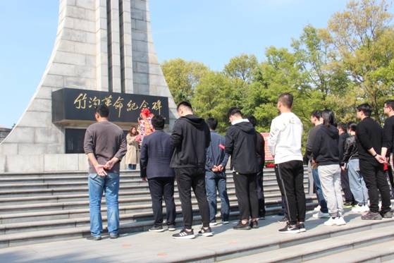 站在革命英雄紀念碑前,全體人員整齊列隊,莊嚴肅穆,向革命烈士鞠躬默哀。